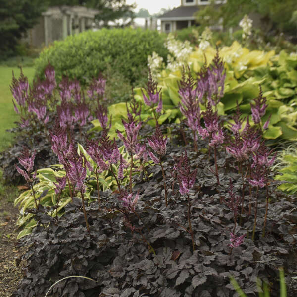 An instant classic for the landscape! 'Dark Side of the Moon' is the only dark leafed Astilbe with purple flowers that's on the market. Rich deep chocolate burgundy leaves form an incredibly attractive mound of foliage. Emerging leaves are yellow with a dark margin with a glossy sheen that become completely dark as they age. Dark stems hold raspberry buds that burst forth with rosy purple flowers. This performs best both for growing and flowering in full sun in the north with adequate moisture, but also grows in shade.
