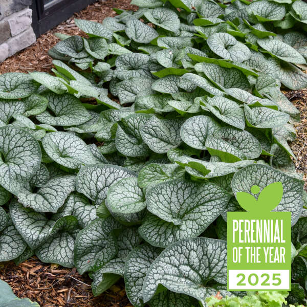 This shade perennial can best be described as a giant version of the classic 'Jack Frost'-with a twist. The huge 9-10" leaves overlap dramatically at the base giving it a shape similar to the snail delicacy escargot. Overall, the foliage is circular from a distance. The leaves have a heavy silver overlay with vivid wide, dark green veining pattern. From mid to late spring, baby blue, forget-me-not type blossoms are held in clusters above the foliage.