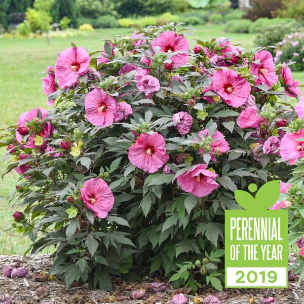 ‘Berry Awesome' has lavender pink flowers and red eye, with contrasting deep midnight green foliage. Flowers are produced from the top to the bottom of the plant, rather than just at the top like some other cultivars. The foliage forms the perfect habit and will be ready to show off from late summer into early fall. ‘Berry Awesome' is the perfect backdrop or centerpiece for sunny borders. Use it in place of a shrub in your garden.